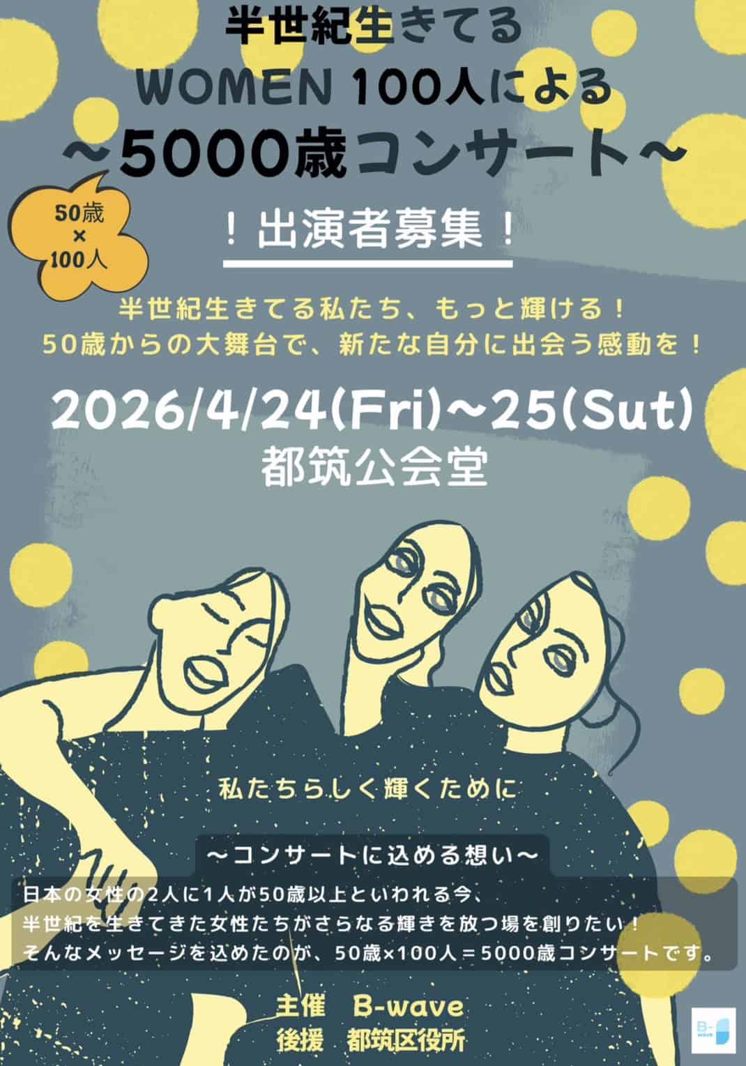 (本番)2026年 4月24・25日 @都筑公会堂(横浜市営地下鉄 センター南駅) 参加条件 アラフィフ以上の女性・経験不問 舞台で歌ってみたい・踊ってみたい・みんなと楽しく部活のノリで交流したい・新しい自分を発見し